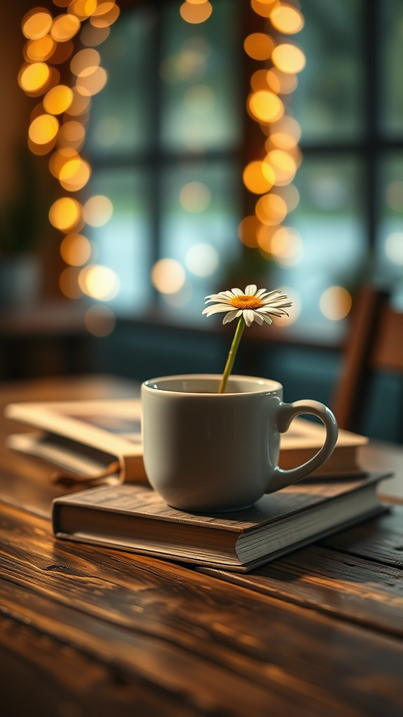 A porcelain coffee mug rests on a rustic wooden table, accompanied by the glow of soft bokeh lights in the background; a sand-colored book with a single daisy atop it adds charm, bathed in atmospheric light, high-detail, sharp-focus visual, artistic and realistic in style, photographed with an f/1.8 aperture, --ar 9:16 setting, capturing the essence of tranquility and warmth.