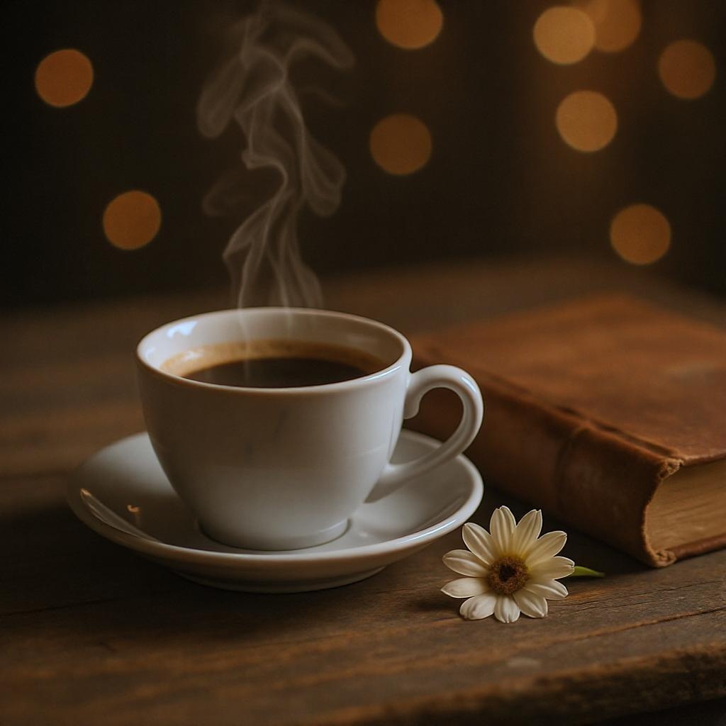 A porcelain cup of steaming coffee rests elegantly on a rustic wooden table, set against a backdrop of soft bokeh lights. Beside it lies a well-worn, leather-bound book and a delicate daisy, illuminated by the warm, ambient glow of the setting. The scene captures an intimate, artistic moment with remarkable attention to detail, featuring a dreamy, blurred background achieved with an f/1.8 aperture, creating a high-quality, lifelike photograph with a unique, vertical composition.