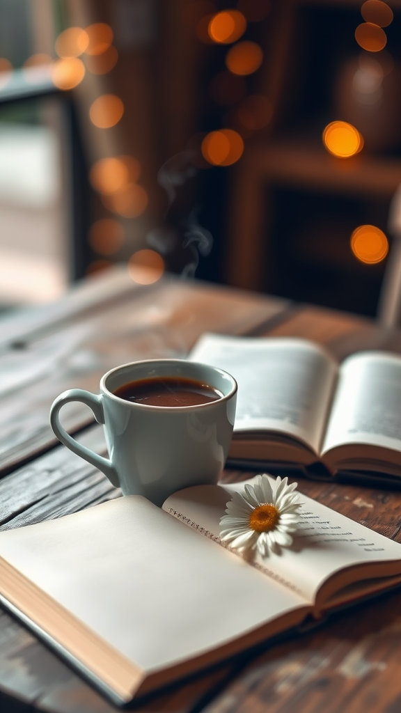 A porcelain cup of steaming espresso sits on a rustic wooden table with a backdrop of warm bokeh lights; beside it rests an open cream-colored book and a single daisy; the scene is bathed in soft, ambient light, captured with exquisite detail and realism, showcasing rich textures and artistic flair, shot with f/1.8 aperture in a tall, elegant 9:16 aspect ratio.