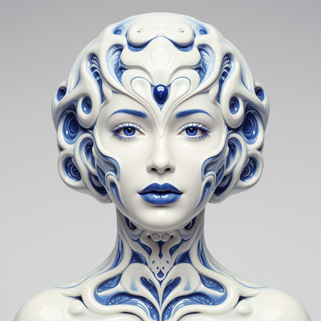 A porcelain woman with an exquisite visage, delicately rendered in harmonious symmetry, adorned in shades of white and azure. Her features are intricately detailed, capturing organic forms with graceful precision. The portrait showcases complex, swirling patterns reminiscent of fine china, exuding an air of meticulous artistry and ethereal beauty.