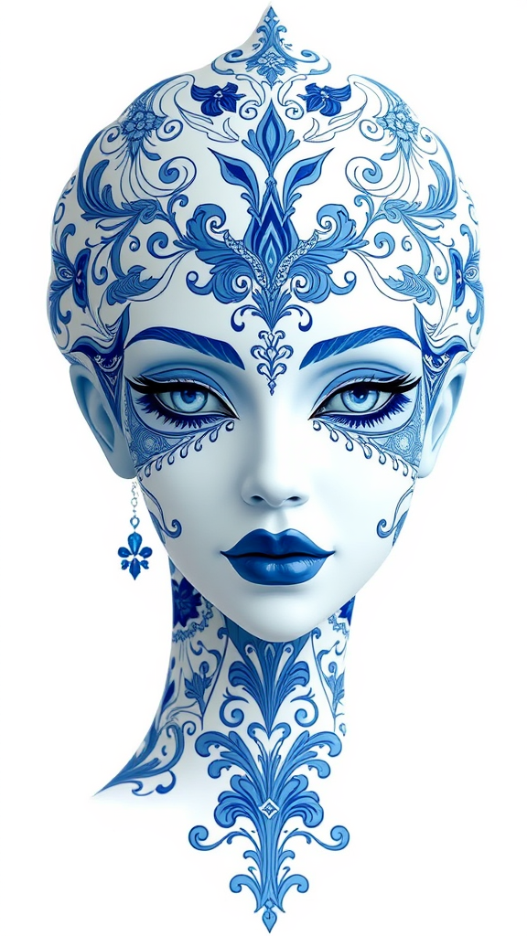 A porcelain woman with intricate blue and white details, designed in perfect symmetry, showcasing delicate and detailed facial features. The portrait blends organic forms with meticulous patterns, resulting in a harmonious composition. The overall style is elegant and refined, capturing a sense of sophistication and grace, while incorporating subtle abstract elements to enhance the visual complexity.