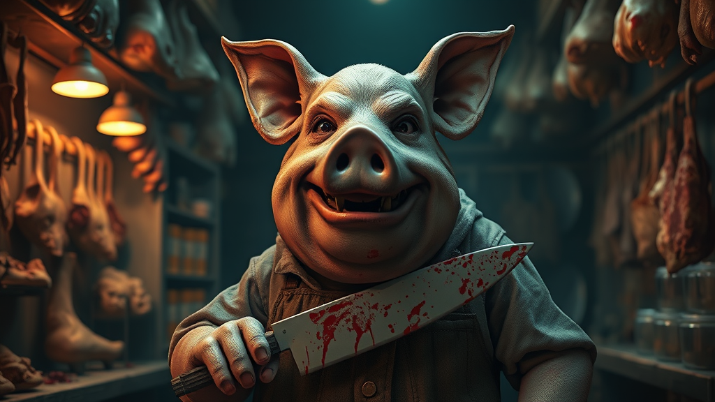 A portly pig working as a butcher stands in a dimly lit shop filled with eerie warmth, offering human parts in the background. It wears a sinister grin with broken teeth, eyes fixed on the camera with unsettling intensity. Clad in blood-stained clothing, it wields a bloody butcher’s knife. The scene is captured in hyper-realistic detail, highlighting dramatic colors and shadows, reminiscent of trending Artstation works. The set is crafted with meticulous attention to detail, yet embraces imperfections: elongated neck and body, skewed eyes, deformed features, and extra or missing limbs, all contributing to an uncanny realism that captures a surreal blend of nightmarish and fascinating visuals.
