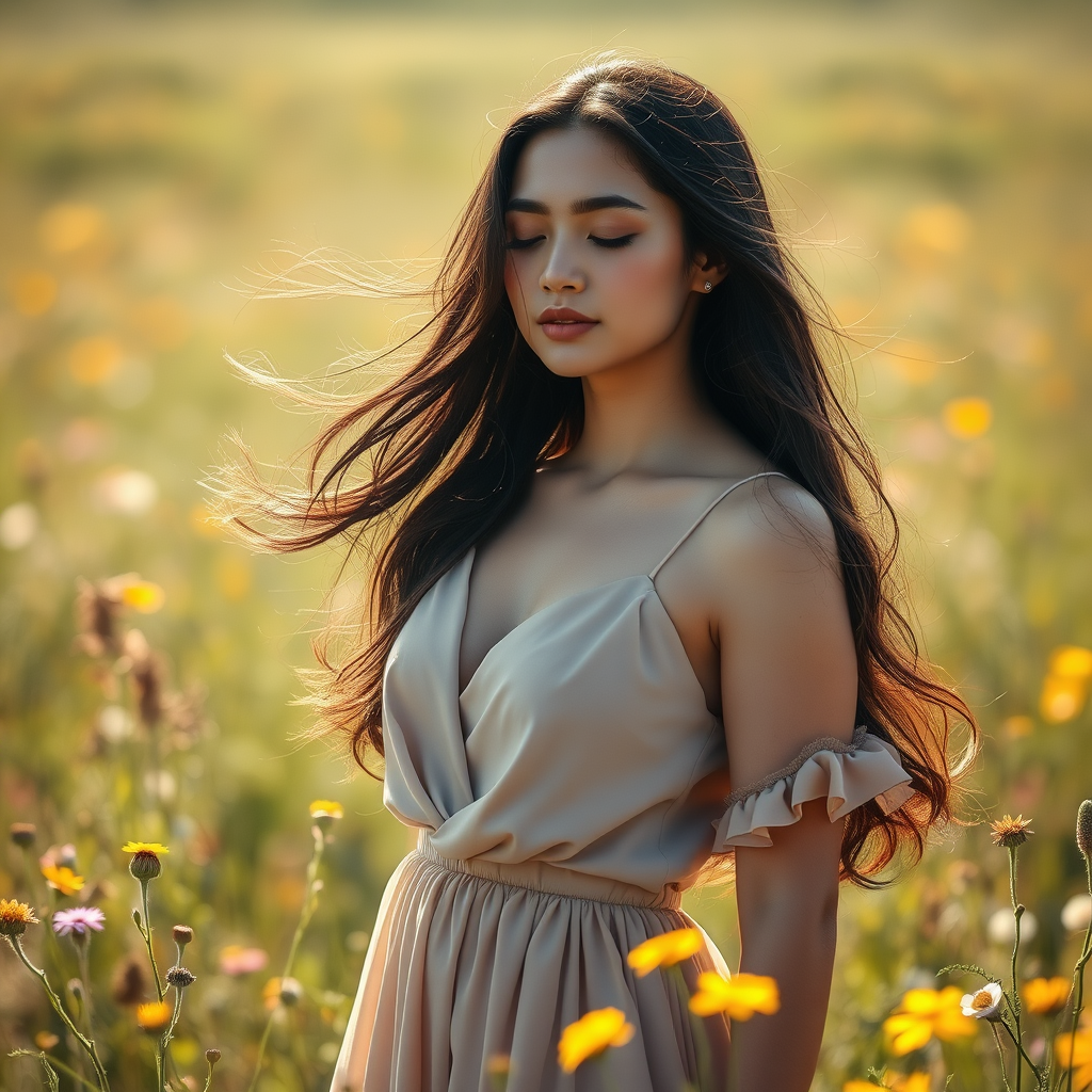 A portrait captures a serene woman with cascading dark hair, standing in a sunlit field with wildflowers surrounding her, wearing an elegant, flowing dress, her eyes softly closed as a gentle breeze brushes against her face, evoking a sense of peace and connection with nature.