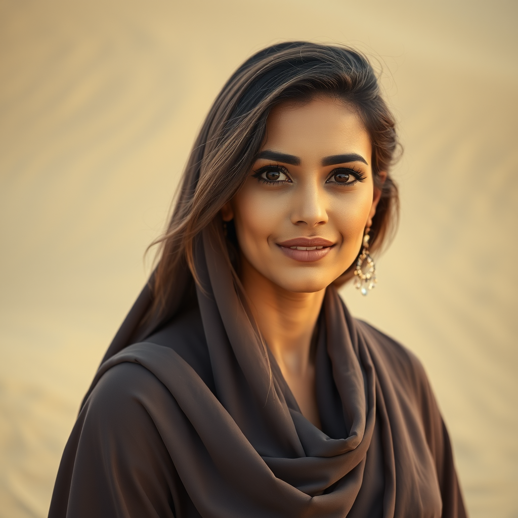 A portrait capturing a 30-year-old Arab woman standing confidently against a soothing sandy backdrop, her eyes reflecting wisdom and strength, with her hair cascading softly over her shoulders, wearing elegant, flowing attire that complements her graceful presence, and subtle traditional jewelry adding a touch of heritage to her modern style.