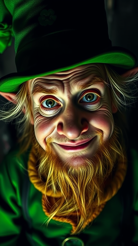 A portrait capturing a playful leprechaun with aged, expressive facial features, the dominant green hues of his attire gleaming vibrantly under dramatic lighting; amidst a shadowy backdrop, a sense of wistful introspection emanates from his twinkling eyes, creating a balance between mischief and melancholy.