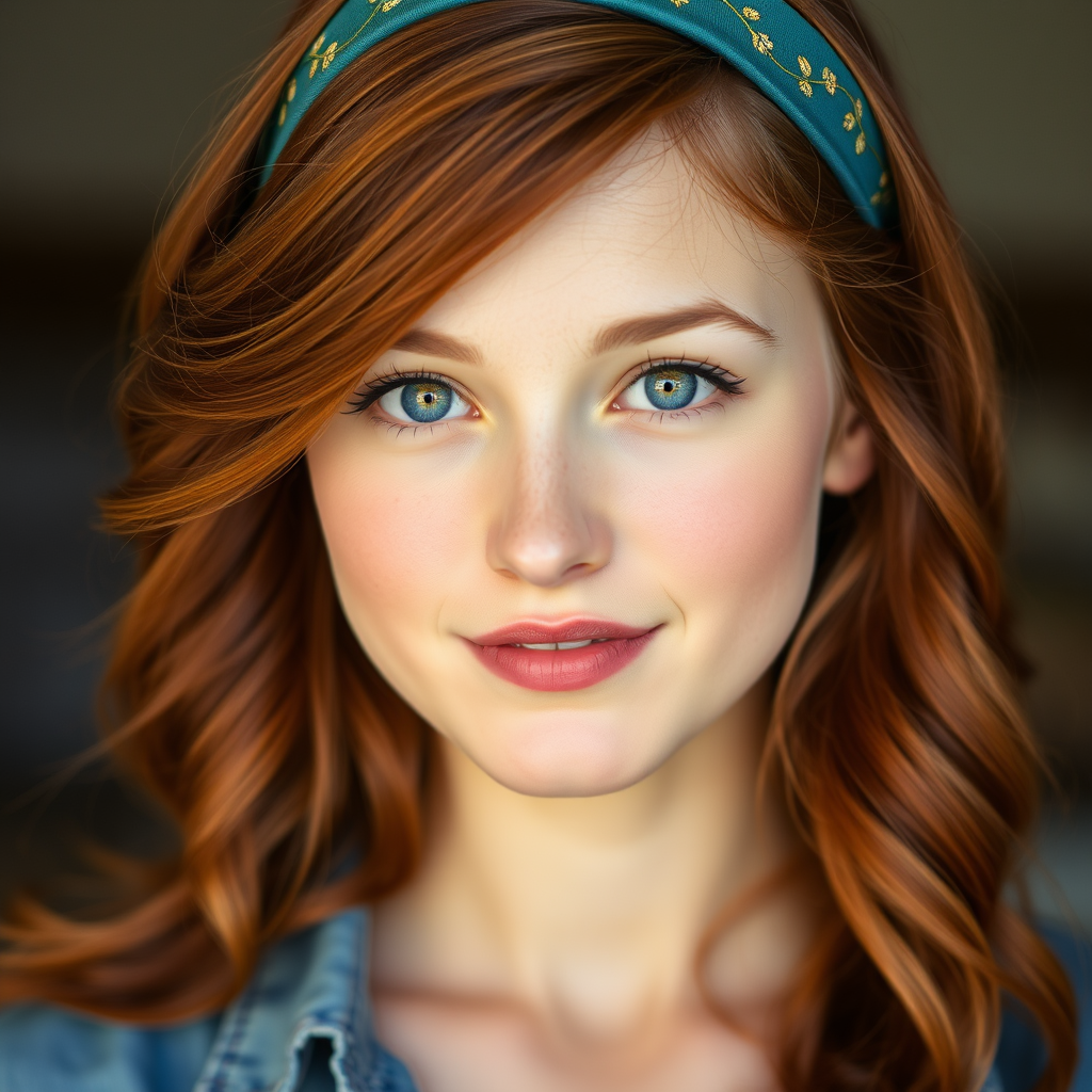 A portrait capturing a young woman exuding tranquil charm with delicate features. Her auburn hair cascades in gentle waves down one shoulder, adorned with a teal headband featuring subtle golden floral designs. Her complexion is radiant and her soft green eyes reflect a quiet assurance. She is dressed in a casual yet chic chambray blouse, embodying understated elegance. The natural lighting casts a soft glow, enhancing the warmth and welcoming essence of the scene.