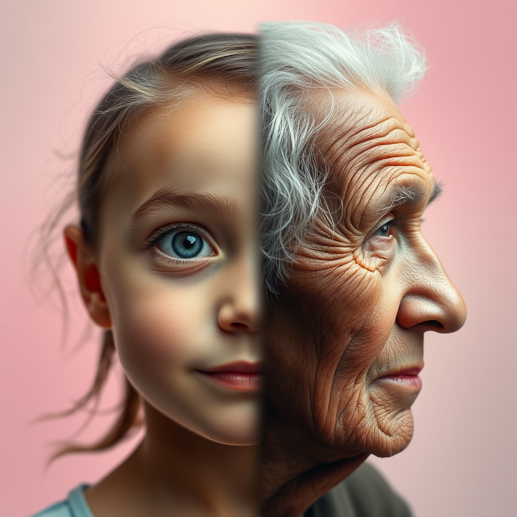 A portrait combining the contrasting features of a youthful girl and an elderly person in their eighties, seamlessly blended to highlight the passage of time; smooth, vibrant skin transitions into wrinkled, textured layers, capturing the essence of innocence and wisdom side by side; one eye sparkles with youthful curiosity, while the other reflects a lifetime of experiences; the background transitions from a bright, pastel palette to muted, earthy tones, symbolizing the journey through different life stages.