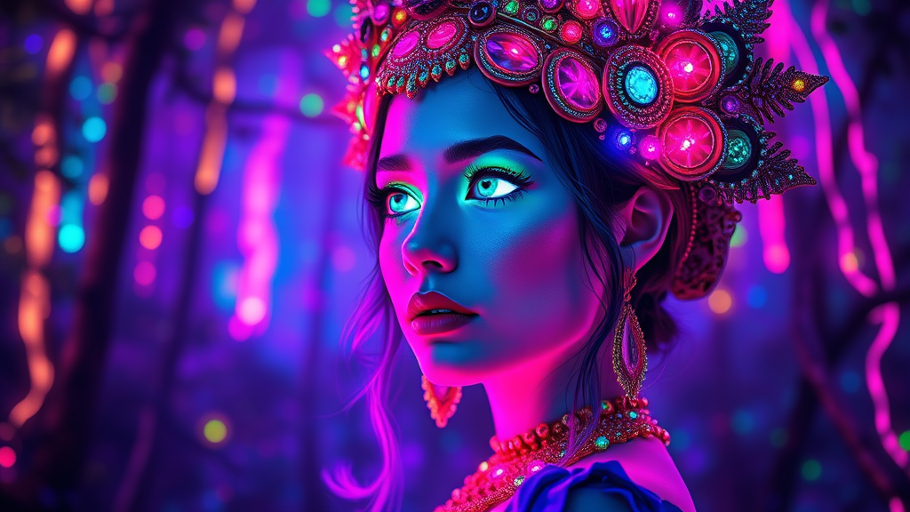 A portrait in wide angle capturing a dream-like woman with a gaze set off to the side, her eyes exuding a lucid charm. She stands enveloped in a daydreampunk aura with skin and eyes that glow. Adorned with an elaborate headdress and bathed in vibrant neon lights, hues of electric blue, lush green, and radiant purple illuminate her bioluminescent essence. The background reveals a vivid forest wonderland, saturated with neon colors, teeming with swirling particles in shades of blue, green, and purple. The composition follows the rule of thirds and golden ratio, featuring an asymmetrical layout in a hyper-maximalist style. Rendered in octane for photorealistic and cinematic realism, the scene is crafted using Unreal Engine, presented in stunning 8k resolution in a 16:9 aspect ratio with sublime creative twists.