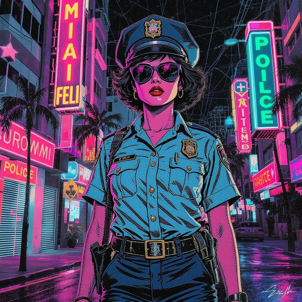 A portrait of a 1980s Miami police woman, centered, intricate, highly detailed, breathtaking beauty, precise line art, vibrant, comprehensive cinematic style inspired by Guy Denning and Sandra Chevrier, 8k resolution, HDR, evokes Vice City feel, includes intentional flaws: text errors, missing or extra digits, cropped composition, JPEG artifacts, artist signature, unusual anatomy, extra limbs, poorly drawn extremities, out of frame elements, tiling, intentional deformities, blurred or fuzzy details, distorted or mutated features, unsettling or unattractive elements, watermarks, and artist identifiers.
