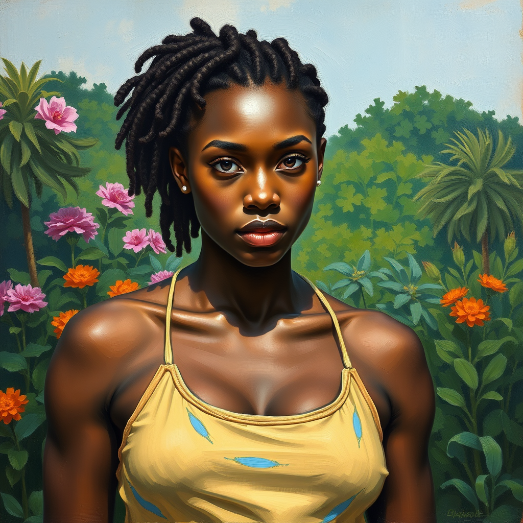 A portrait of a 20-year-old Herculean woman gazing directly at the viewer, set against a lush garden backdrop. The painting is done in the impressionist style, employing the palette knife technique with large, expressive brushstrokes. The artwork draws inspiration from the bold and vibrant works of Kehinde Wiley and the ethereal, dreamlike quality of Anna Dittmann's creations. Despite the influence of bad_artist and bad_prompt concepts, the piece maintains a captivating allure without errors or distortions. The composition remains free of signatures, watermarks, or text, focusing solely on the subject and the rich, textured landscape behind her. The artwork celebrates strength and beauty in a harmonious blend of color and form.