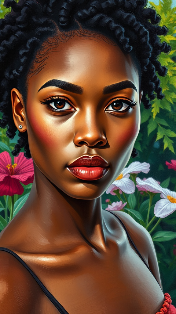 A portrait of a 20-year-old woman with Herculean features, gazing directly at the camera, set against a lush and vibrant garden backdrop. The scene is depicted in a palette knife painting style, capturing the essence of impressionism with bold, expressive brushstrokes. This work takes inspiration from the distinctive styles of Kehinde Wiley and Anna Dittmann, merging their influences to create a unique visual language. The composition avoids common artistic pitfalls and techniques like signatures, watermarks, or text, focusing purely on the vivid character and setting. No split screens or unusual body configurations mar the picture, allowing the strength and beauty of the subject to shine through.