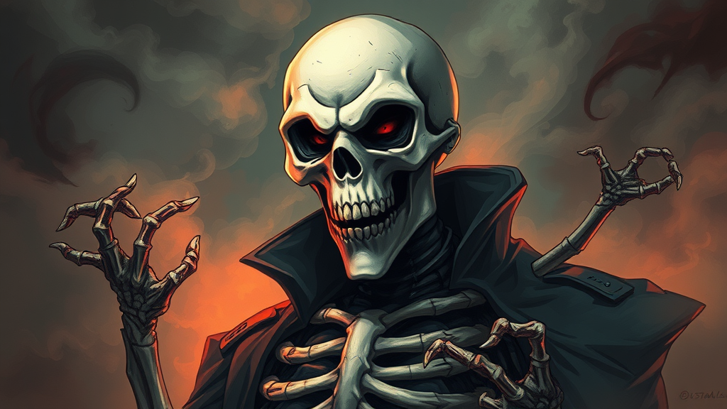 A portrait of a badass supervillain wearing a skeleton mask, exuding a brutal, techno aura with light and muted colors amidst swirling smoke. The style blends anime and comics, with an epic composition and dramatic flair in digital painting. Intricate attention to detail is evident, capturing the essence of a menacing figure. The character is depicted with intentionally flawed elements: a distorted body with extra limbs and deformed features, such as a long neck and morbid proportions. The face and hands are poorly drawn, contributing to the unsettling appearance. Cloned and disfigured facial features enhance the eerie vibe. Despite the grotesque proportions and missing or malformed limbs, the character's essence remains impactful. Emphasizing the presence of digital imperfections, such as low quality and jpeg artifacts, the image includes cut-off elements and distorted anatomy, along with watermarks and signatures, providing a chaotic yet compelling visual narrative.