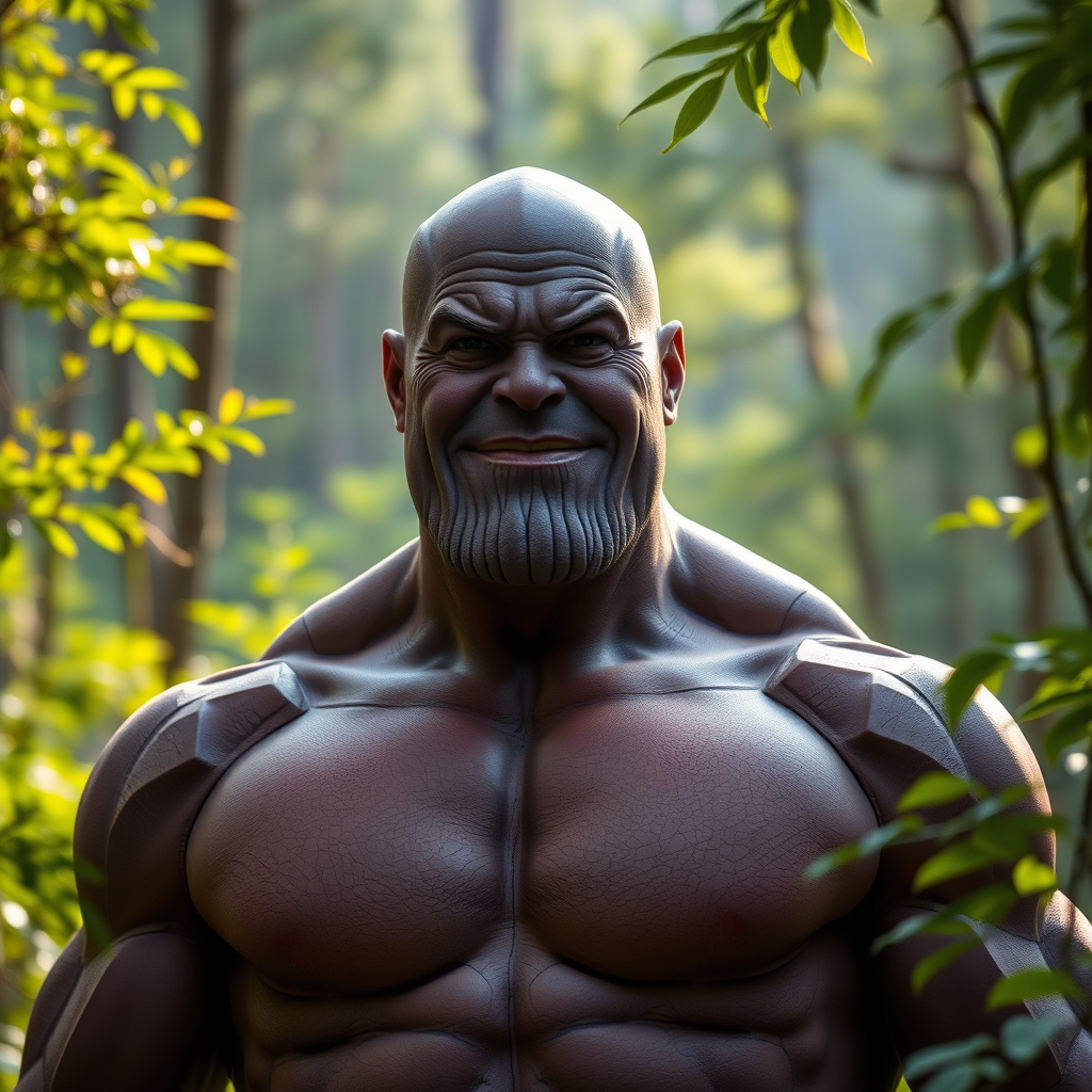 A portrait of a benevolent Thanos standing amidst the lush greenery of a Himachal Pradesh forest, showcasing clear facial features with a gently smiling expression, a broad chest, and a toned physique. Captured with a cinematic flair using a 20mm lens and an f/1.8 aperture, accent lighting enhances his presence while global illumination highlights the vibrant forest backdrop, adding depth and warmth to the scene.