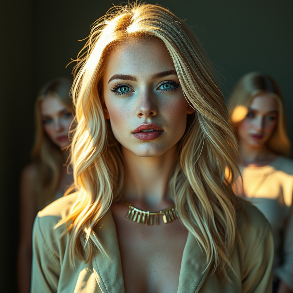 A portrait of a blonde woman wearing various outfits, featuring tones of deep teal and gentle amber, portrayed through prismatic imagery. The image blends multiple artistic styles, showcasing Whitcomb-girls-inspired aesthetics, and bathes in a rich golden light. It combines elements of celebrity portraiture mashups, rendered in stunning 8k resolution, with an aspect ratio of 2:3. The overall style is raw and visually striking.