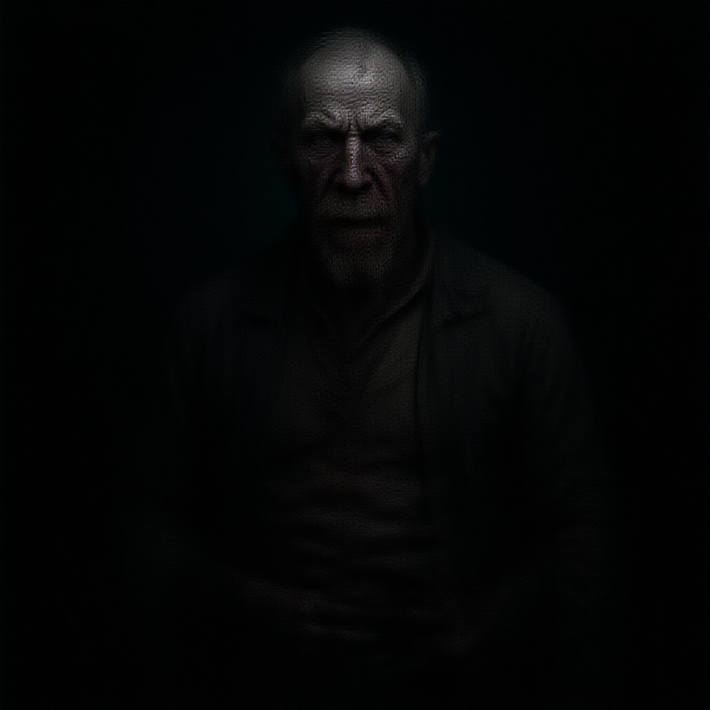 A portrait of a brutal man, weary and utterly isolated, exuding a calm yet deeply unsettling aura. The composition is dark and haunting, capturing the essence of horror in its gloomy tones. It is unforgettable, evoking a profound emotional depth with its intricate details, leaving a lingering impression on the psyche. The image is marred by artifacts of low quality—ugly and distressing, with several distracting elements: poorly drawn hands and face, mutations and deformities. His anatomy is flawed, with disfigurations like extra limbs and cloned features, all set against grossly mismatched proportions. His long neck and malformed limbs are unsettling, while missing and excessive limbs add to the disconcerting image. Disfigured and marked by imperfections, the distorted portrayal is marred further by remnants of technical flaws such as camera and watermark remnants, blurred outlines, and proportional inaccuracies, ultimately delivering a grotesque yet impactful visual experience.