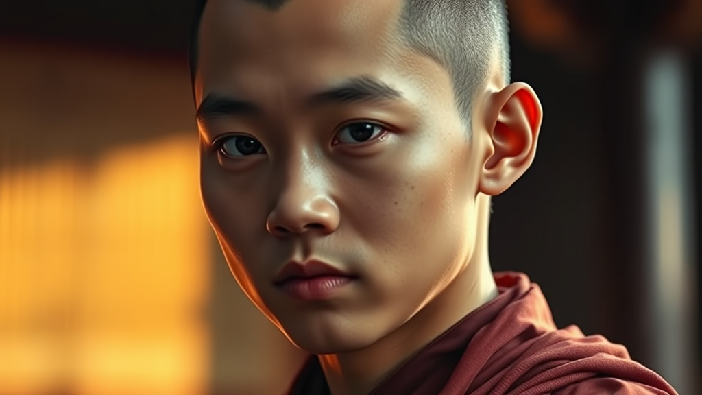 a portrait of a captivating young zen monk, deeply serene and ethereal, photographed in ultra-high resolution, utilizing cinematic lighting that casts a gentle, warm glow, captured with a 35mm lens at f1.4 for a shallow depth of field effect, emulating the vivid tones of fuji color film, subtly enhanced with a relaxed and balanced negative film effect for a harmonious and tranquil ambiance