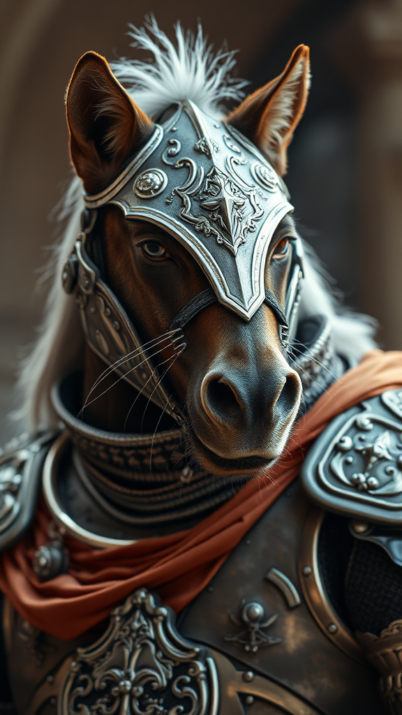 A portrait of a cat knight in finely detailed armor, featuring an intricate design of silver and silk, with cinematic lighting highlighting the craftsmanship, in a 4k resolution. The scene exudes a sense of danger, with the horse appearing powerful and majestic. The image is carefully composed to avoid any negative elements, ensuring a clear and striking visual experience.