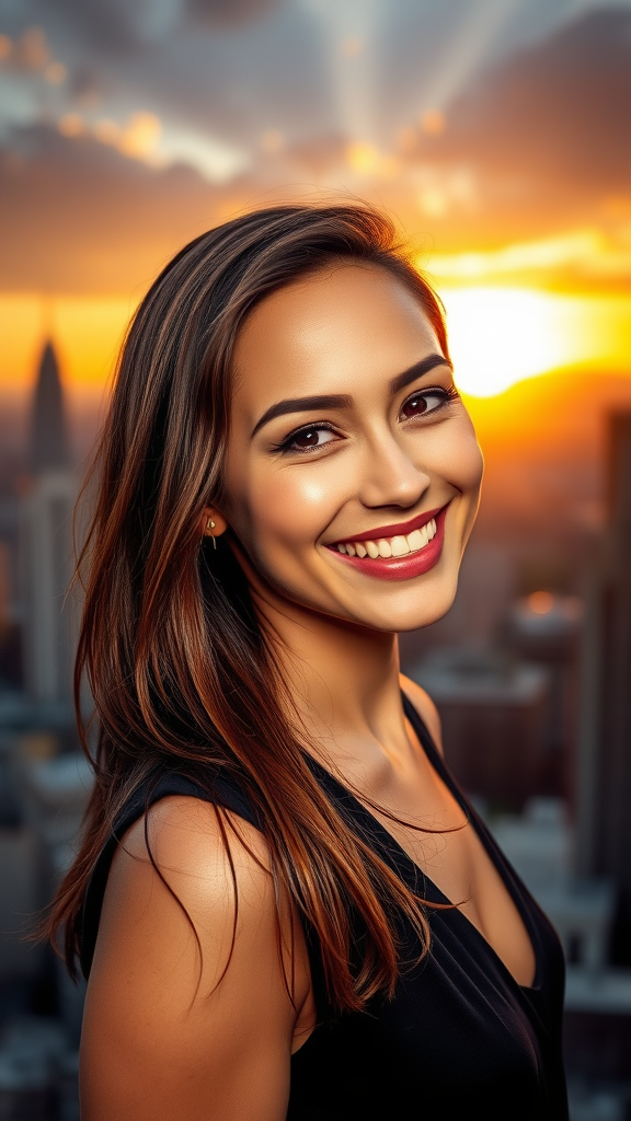 A portrait of a cheerful woman with wet, slicked-back chestnut hair cascading over one shoulder, gazing warmly at the camera with a gentle tilt of her head. She is dressed in a sleeveless black blouse, exhibiting a fresh makeup style that enhances her natural beauty. The backdrop features a vibrant city skyline at sunset, with the golden hues of the sun casting a soft glow over the urban landscape.