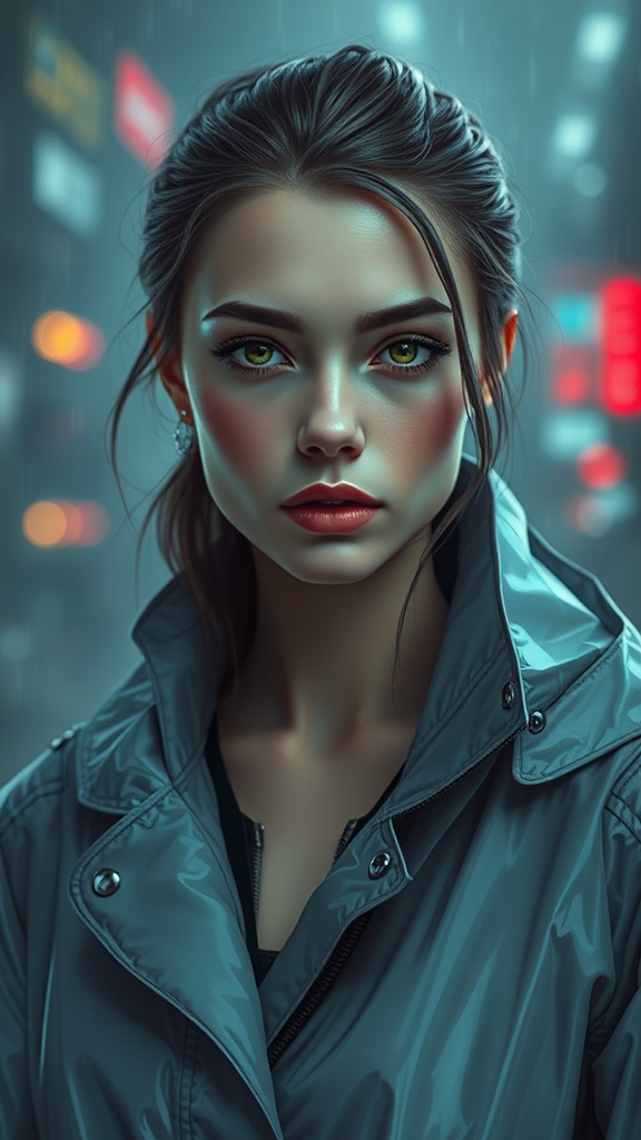 A portrait of a European young woman clad in a sleek, futuristic raincoat jacket reminiscent of a stormy movie scene. Her attire blends sci-fi fashion with elements of regal elegance, drawing influence from artists like Ismail Inceoglu, Dragan Bibin, and Greg Rutkowski. Her face is impeccably detailed, showcasing sharp features and a flawlessly smooth complexion. The style merges cyberpunk and neotokyo aesthetics, highlighted by low-emission neon hues and synthwave influences, evoking a scene from a Bladerunner-inspired universe with subtle creative twists to maintain an innovative flair.