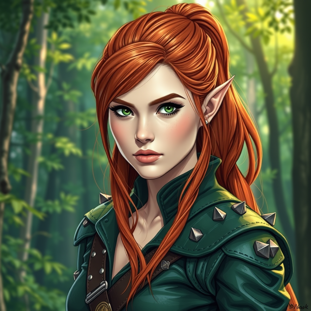 A portrait of a female elf ranger, her long fiery red hair tied in a sleek ponytail. She wears a green and brown leather outfit adorned with subtle spikes, exuding both elegance and resilience. The scene is centered on her, capturing her intricate details with breathtaking beauty. The lineart is precise, and the colors are vibrant with a comprehensive cinematic quality, reminiscent of the style of Bastien Lecouffe-Deharme. The background is a lush forest, complementing her attire and enhancing her enigmatic allure. Her expression is one of determination and wisdom, embodying the spirit of nature.