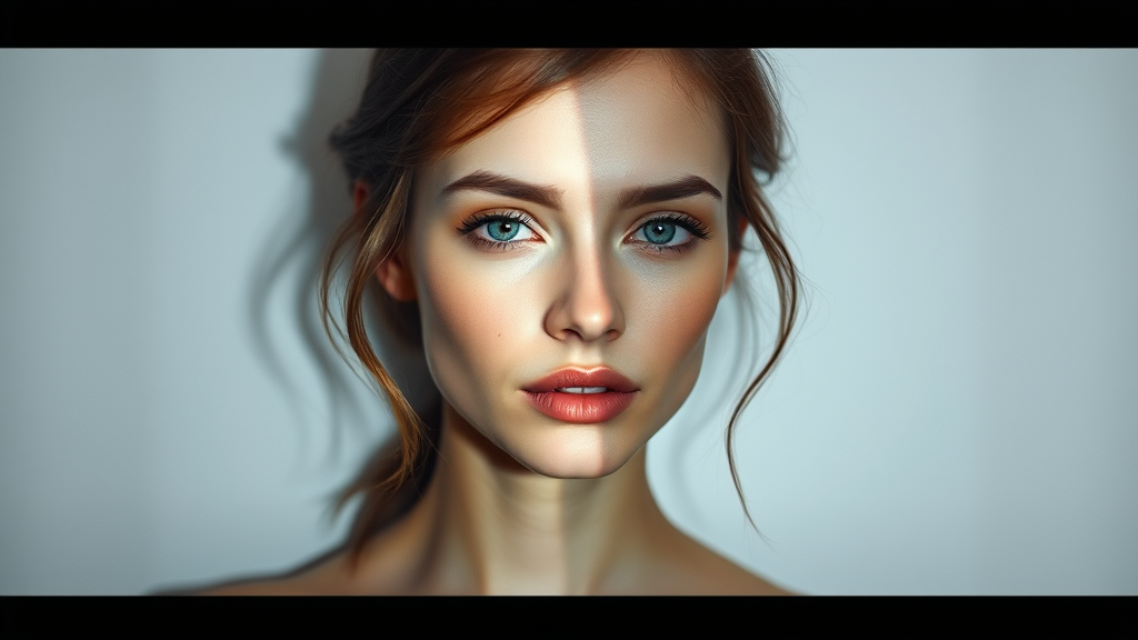 A portrait of a female model against a plain white backdrop, soft light reflecting across her features, rendering parts of her face ethereal and almost transparent, capturing an enigmatic essence with a raw and unfiltered style, engaging and mysterious atmosphere.