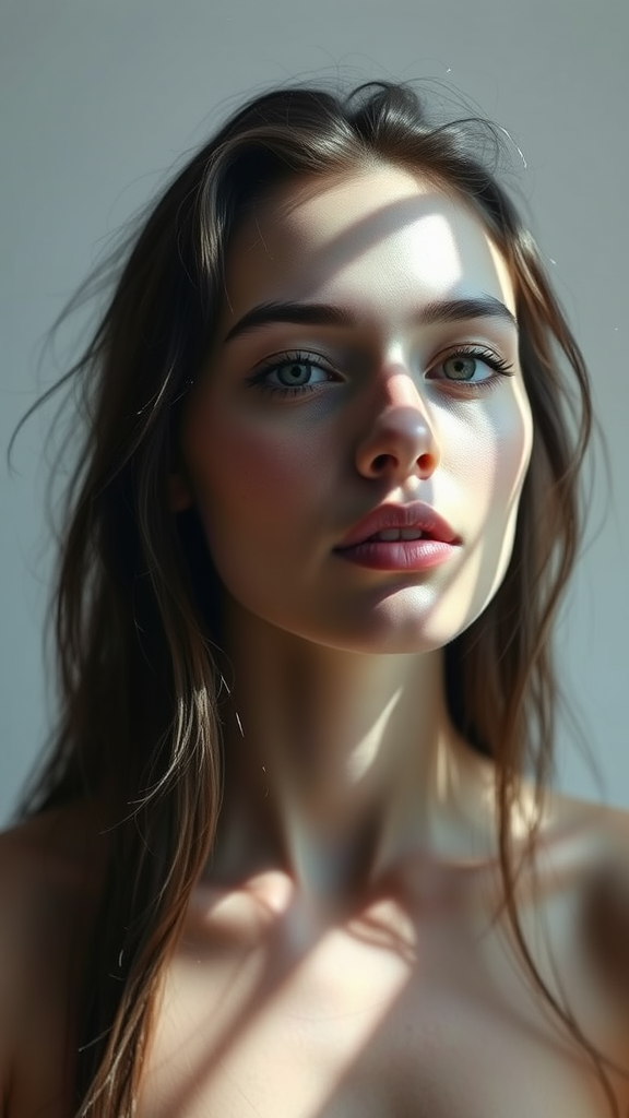 A portrait of a female model on a minimalist white backdrop, with ethereal light flares cascading across her features, creating a ghostly, almost spectral presence, her expression serene and enigmatic, the image capturing raw and unrefined beauty with an aspect ratio of 4:5.