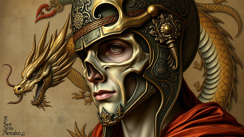 A portrait of a figure wearing a skull helmet, adorned with intricate dragon motifs, reminiscent of Pinturicchio’s style, infused with the ornate detailing and elegance of Jessie Arms Botke’s work. The composition boasts large-scale proportions with a harmonious blend of light bronze and bronze hues, complemented by engraved line-work that accentuates the figure's regal presence. The background features subtle elements of dragon art, providing an air of mystique and grandeur to the overall artwork.