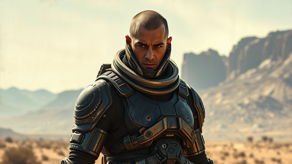 A portrait of a futuristic space soldier standing in bright daylight, their armor blending H. R. Giger's biomechanical intricacy with the rich, textured brushstrokes reminiscent of Rembrandt's oil paintings. The background depicts an alien landscape, subtly enhancing the contrast between the soldier's advanced gear and the natural environment. The lighting highlights the detailed patterns on the armor, casting dramatic shadows and adding depth to the figure, with a focus on capturing an intense, contemplative gaze.