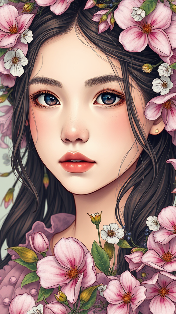 A portrait of a girl adorned in a gown of blooming flowers, echoing the style of Artgerm with fluid linework and rich, intricate details. Her facial features are exquisitely defined, capturing an essence of elegance and grace. The scene embodies a cottagecore aesthetic, infused with the tranquility and beauty of nature. The close-up perspective enhances the intensity of her expression, drawing the viewer into a world where nature and artistry blend seamlessly.
