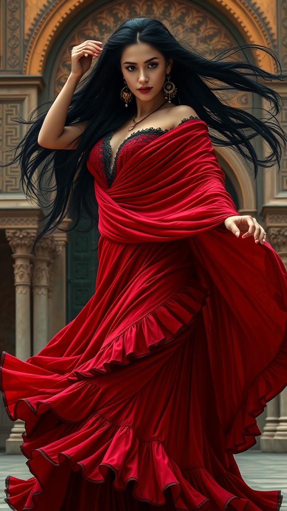 A portrait of a graceful dancer with intricate giant earrings and flowing black hair, adorned in a very long dress that features a huge shawl. The dress embraces the bata de cola style with captivating frills and flounces, rendered in a striking red-black palette. Behind her, a Mudéjar style and Romanesque architecture provide a majestic backdrop. Her pose is dynamic and passionate, capturing the essence of tribal dark fantasy with dramatic shadows enhancing her emotional expression. The composition is epic, channeling the evocative style of Fabian Perez.