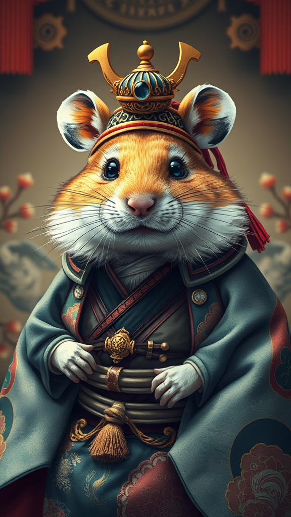 A portrait of a hamster majestically dressed as a feudal Japanese emperor, perfectly centered. This key visual showcases intricate and highly detailed features that illustrate breathtaking beauty with precise linework. It highlights vibrant and comprehensive cinematic elements inspired by Carne Griffiths and Conrad Roset. The art is rendered in 8k quality, capturing the essence without low-res artifacts or disfigurements. The composition avoids imperfections such as missing or extra digits, poorly drawn anatomy, and misalignments. There are no markings, watermarks, or signatures to detract from the piece’s stunning impact.