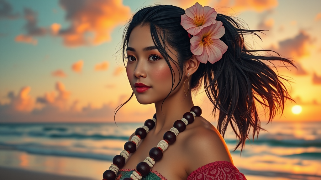 A portrait of a Hawaiian girl on the beach at dawn, adorned in a traditional outfit. The scene is centered and intricate, capturing a breathtaking beauty with precise lineart. The vibrant colors pop with a comprehensive cinematic flair, reminiscent of the styles of Laurie Greasley and James Jean. The depiction is in 8k and HDR quality, ensuring every detail is visible. Despite the artistic inspiration, the image is free from errors such as missing or extra digits, cropped sections, or any elements like jpeg artifacts and bad anatomy. The composition focuses on elegance, avoiding any poorly drawn features or disfigurements. The artwork is complete without any out-of-frame elements, tiling issues, or deformations, maintaining a clear and aesthetically pleasing presentation. There are no unwanted additions such as watermarks, text, or artist signatures, ensuring the image remains polished and undistracted.