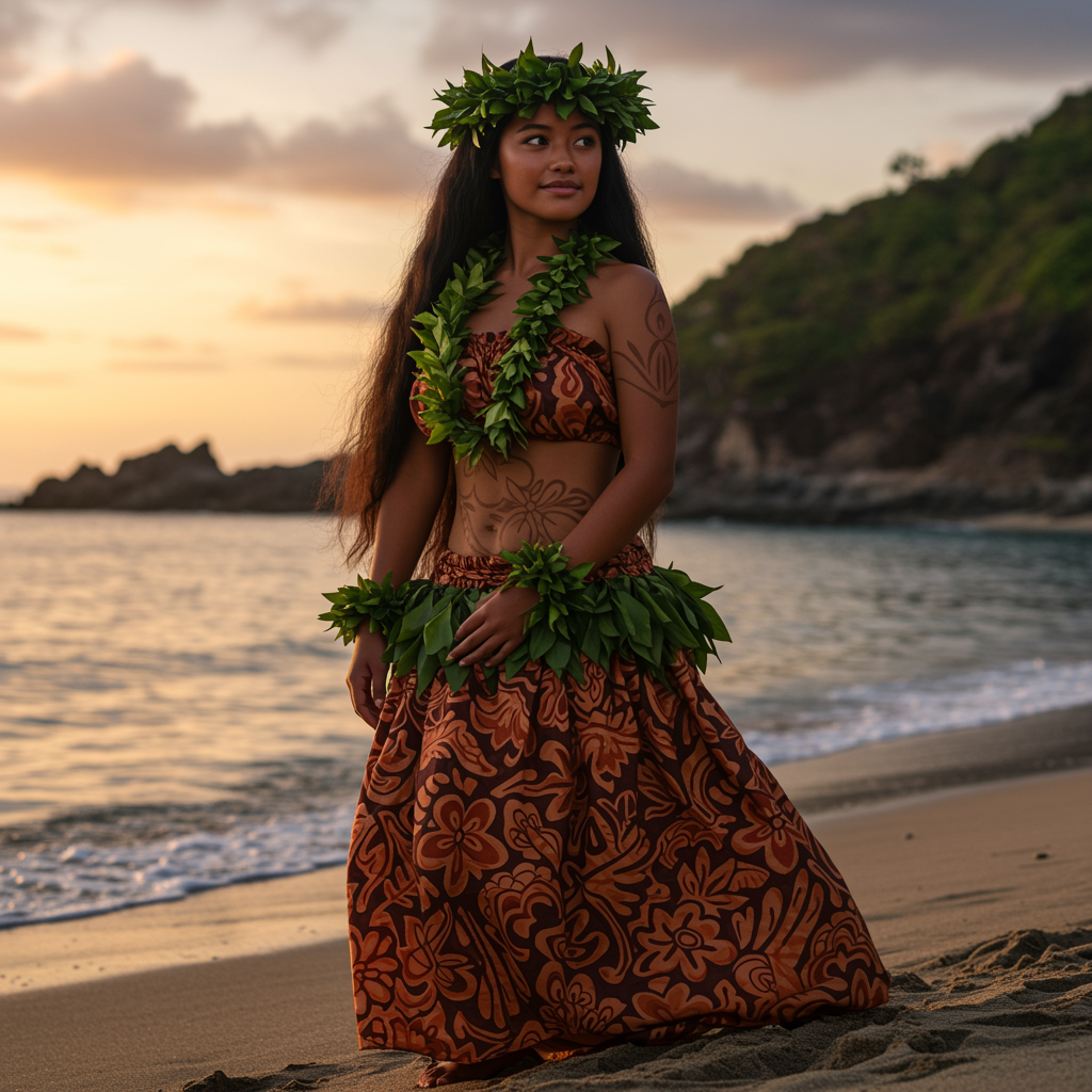 A portrait of a Hawaiian girl on the beach at dawn, wearing a stunning traditional outfit. The scene is centered and showcases intricate, highly detailed artistry. Her breathtaking beauty is highlighted through precise linework and vibrant colors. The composition is cinematic, reminiscent of works by Laurie Greasley and James Jean, capturing a comprehensive and immersive experience. The portrayal is rendered in 8k with HDR quality, exhibiting elegance and grace.