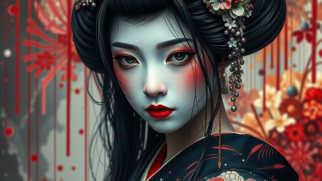 A portrait of a Japanese black-haired geisha with a melancholic expression, featuring dripping art elements in a vibrant explosion of color, crafted with exceptional detail and elegance. The hypermaximalist approach highlights intricate details, achieving super-resolution and megapixel clarity. This epic composition offers a hyper-realistic depiction with small creative touches, capturing both the traditional beauty and complex emotions of the geisha in a transformative and visually stunning manner.