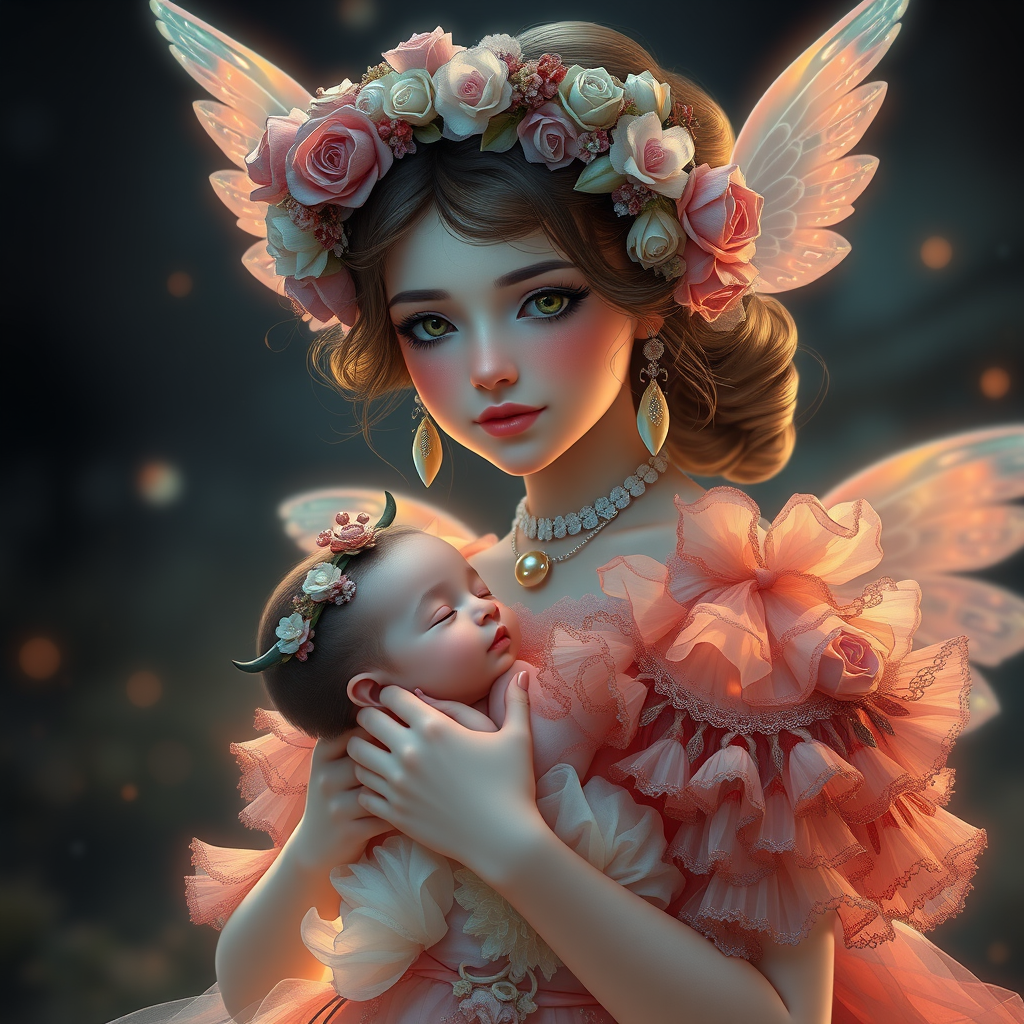 A portrait of a magical Lolita girl with a dreamy, ethereal presence, radiating a peaceful expression. She wears an ornate, frilly dress that exudes fantasy and elegance, holding a cute baby in her hands. The digital painting is highly detailed, inspired by the art styles of Artgerm, Greg Rutkowski, and Alphonse Mucha, featuring glow effects and a hand-drawn quality. Rendered in 8k resolution, utilizing octane render, cinema 4d, and blender for a dark yet atmospheric background with a big depth of field. The masterpiece is a vibrant, hyperrealistic oil painting with vivid colors and intricate details. Trending on ArtStation and CGSociety, the artwork is a dramatic, photorealistic depiction reminiscent of works by Ed Blinkey, Atey Ghailan, Jeremy Mann, Greg Manchess, and Antonio Moro. The scene is sharp in focus and presented in UHD, embodying a cinematic and sensual atmosphere with absurd levels of resolution.