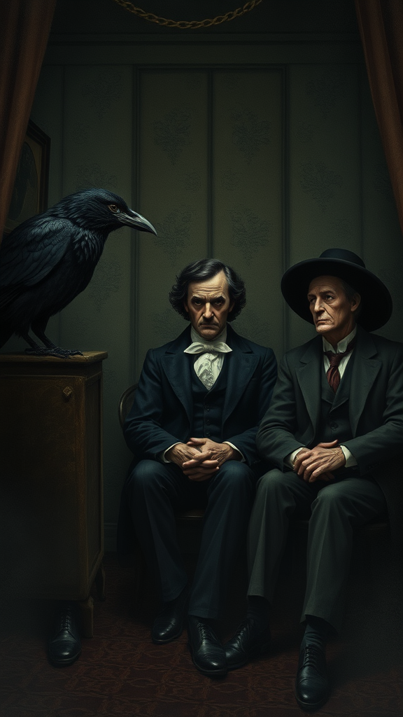 A portrait of a raven, Edgar Allan Poe, and H. P. Lovecraft seated in a dimly lit room, evoking a sense of brooding and introspection, with digital illustration capturing highly detailed clothing and expressive facial features, inspired by the artistic styles of Edward Gorey, Tim Burton, and Mike Mignola. The scene is enveloped in a subdued and muted color palette, emphasizing its gothic and atmospheric essence. The ambiance is steeped in mystery, with intricate shadow play and textures adorning the background, setting an eerie yet captivating tone to the composition.