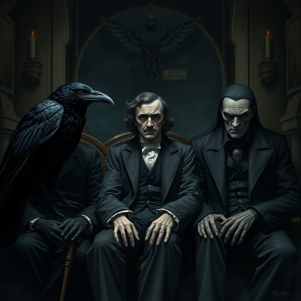 A portrait of a raven, Edgar Allan Poe, and H. P. Lovecraft seated in a dimly lit room, imbued with a sense of brooding and introspection, digital illustration showcasing highly detailed clothing and expressive facial features, art influenced by the styles of Edward Gorey, Tim Burton, and Mike Mignola, utilizing a subdued and muted color palette with a distinctly gothic atmosphere, focusing on intricate textures and shadowy depth.