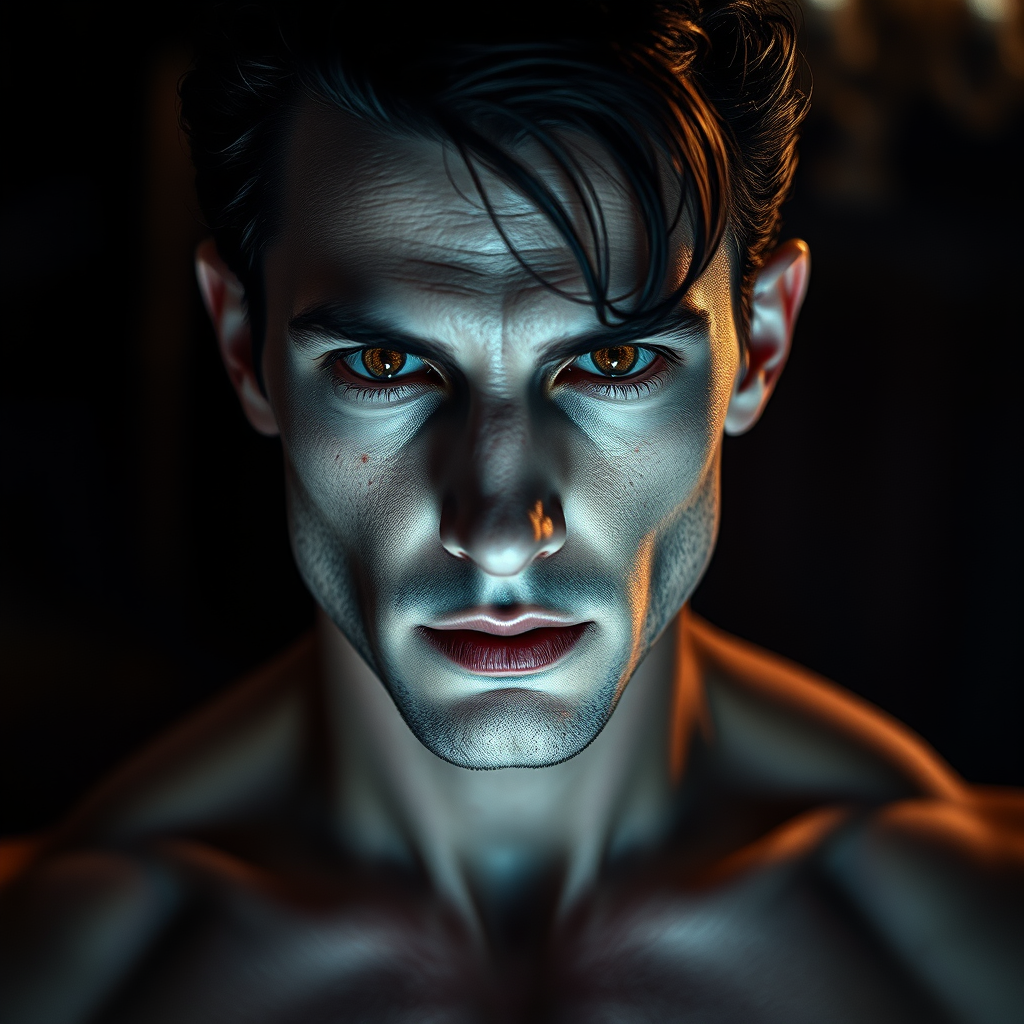 A portrait of a refined and enigmatic bohemian vampire, a darkly handsome man with a muscular build, exhibiting a highly detailed and captivating face. His perfect eyes, with round pupils, are both alluring and anatomically precise. The scene is illuminated with dramatic lighting, enhancing his features with soft details, rendered in HDR quality. This image evokes the elegant styles of Edmund Blair Leighton, Brom, and Charlie Bowater, with facial mastery akin to the works of Tom Bagshaw and the classic touch of Sargent. The portrait is captured in exquisite detail, spanning 4k to 8k resolutions, evoking the timeless allure of a perfect vampire rendered in both contemporary and classic artistic expression.