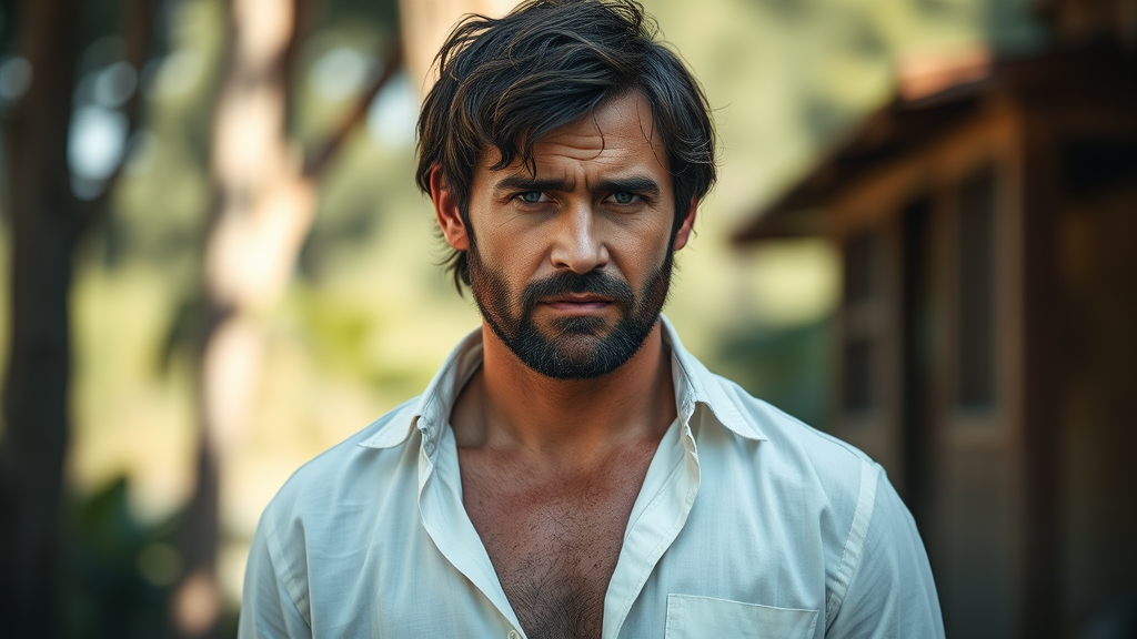 A portrait of a rugged Pedro Pascal inspired by The Last of Us, dressed in a casually unbuttoned white linen shirt, bathed in natural outdoor light. Photographed with a Hasselblad H4D 200MS Digital Camera using a Mitakon Speedmaster 85mm f/1.4 XCD lens, capturing the essence of his unshaven, tough character.
