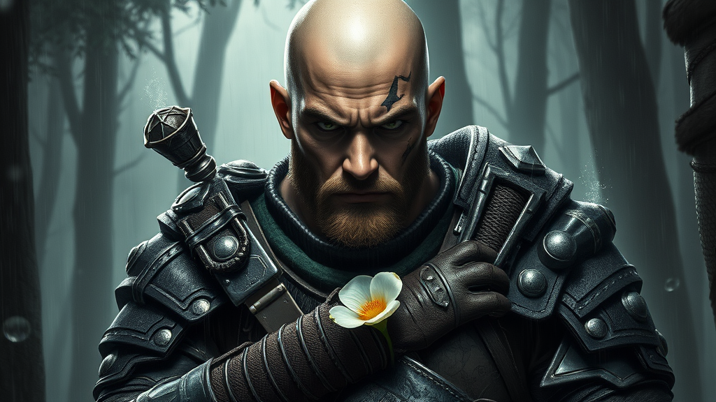 A portrait of a rugged young ranger with a piercing cold stare, clad in detailed armor, bald and grizzled, exuding anger and determination. The setting is a dark, mystical forest illustrated with deep shadows and dim light, capturing the essence of a majestic and cluttered environment. The ranger stands in a dynamic pose, presented as a full body view in an 8k unity render, emphasizing realistic hands and intricate facial features with visible pores. The digital painting is inspired by the styles of Artgerm, WLOP Ilya Kuvshinov, Greg Rutkowski, and Alphonse Mucha, showcasing a high level of detail and smooth, sharp focus reminiscent of concept art. Heavy rain and floating particles enhance the atmosphere, with trim and two-tone lighting adding depth. The presence of subtle facial markings and a flower adds an intriguing element. The artwork incorporates elements of blur and haze, creating a dramatic monochrome effect with hints of two-tone lighting, ensuring stunning visual impact.