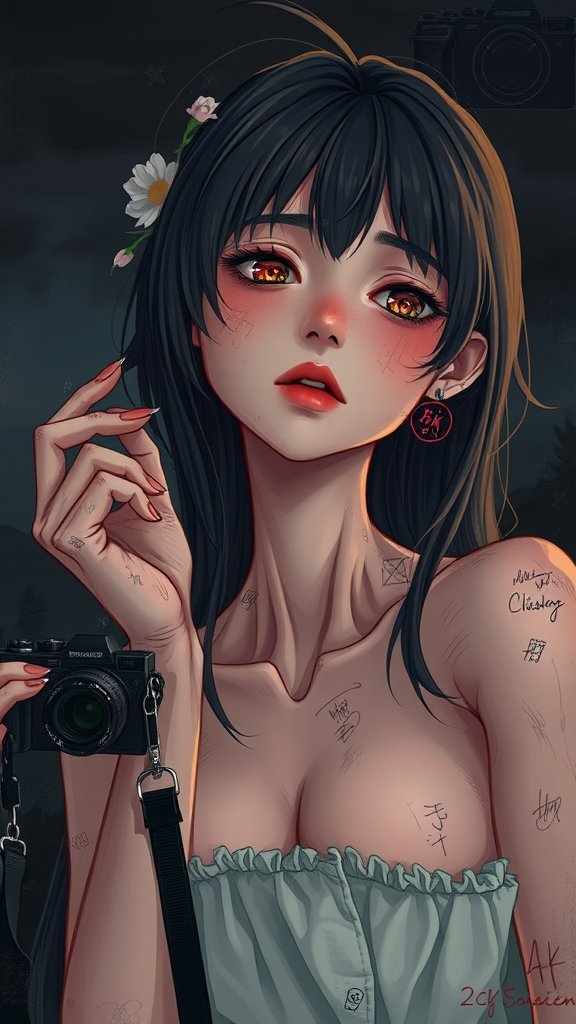 A portrait of a self-absorbed girl in a paradisiacal setting, with an emotive and sultry expression, anime-inspired with comic elements, capturing an intricate digital painting style with 8k resolution. The scene features a dark background with muted colors, evoking a rough aesthetic. Despite the beauty of the setting, the image intentionally incorporates elements of distortion: low-quality jpeg artifacts, duplicated and mutated features, poorly drawn hands and face, and unnatural proportions. The figure is depicted with disfigured, dehydrated traits, extra or missing limbs, and malformed anatomy. Her long neck and other exaggerated features contribute to the eerie visual. The composition is cluttered with unnecessary details like cameras, signatures, watermarks, or logos, with parts of the image cut off or censored, highlighting deformities.