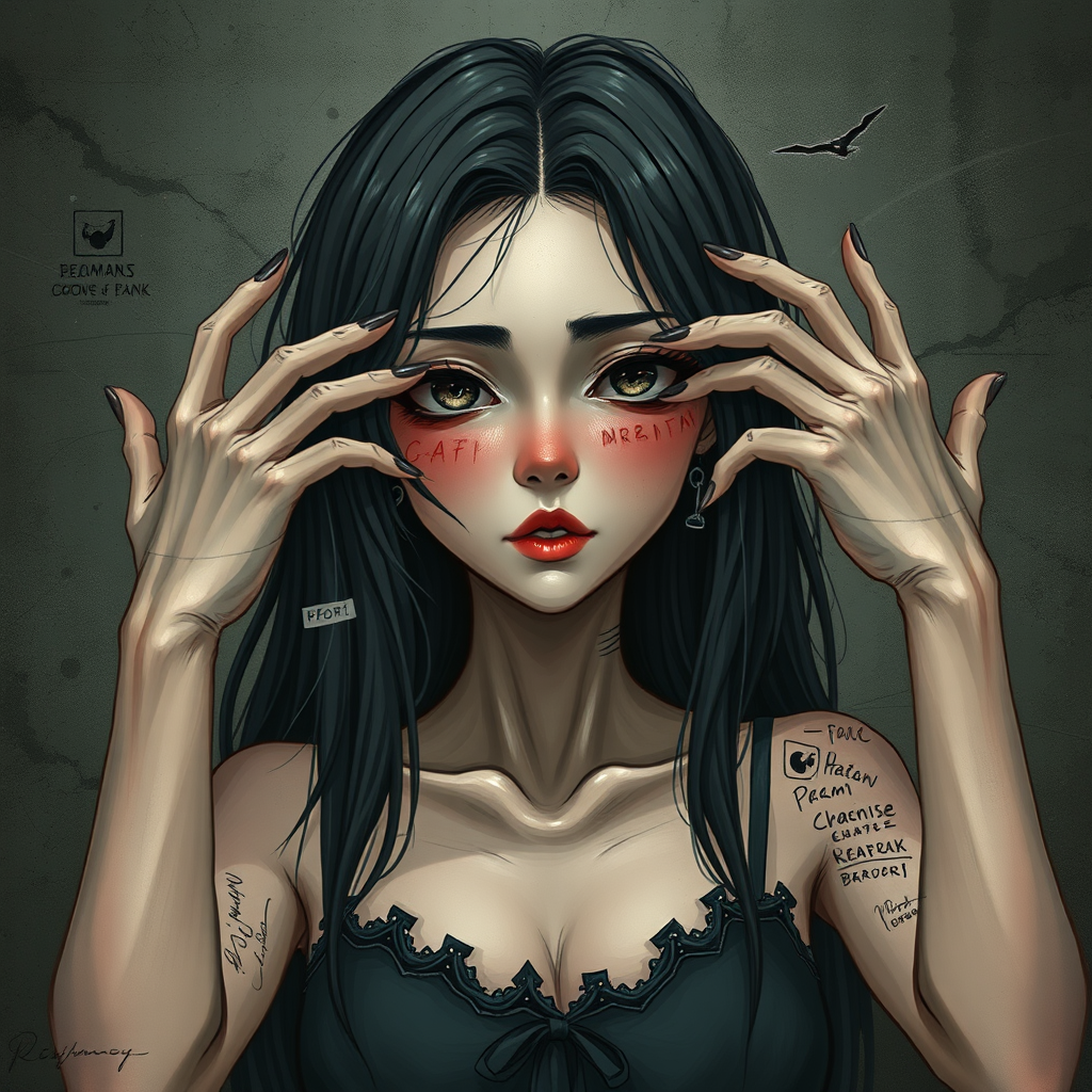 A portrait of a self-absorbed young woman in a paradise setting, with an expressive and alluring face, styled in anime and comic influences, rendered in 8k resolution with a rough, dark backdrop. The muted color palette and digital painting technique enhance the intricate details. The portrayal, however, is flawed by low quality and jpeg artifacts, resulting in an unsettling and distorted appearance. The figure exhibits characteristics of deformation: blurred outlines, dehydrated features, and poorly drawn hands and face, with erroneous anatomy and proportions. Extra limbs and duplicated facial features, including a disfigured and elongated neck, contribute to the grotesque effect. Various elements like names, signatures, watermarks, and logos appear carelessly integrated, with parts of the body oddly cut off or censored. The depiction reflects disjointed and malformed attributes, embodying a surreal and eerie vision.