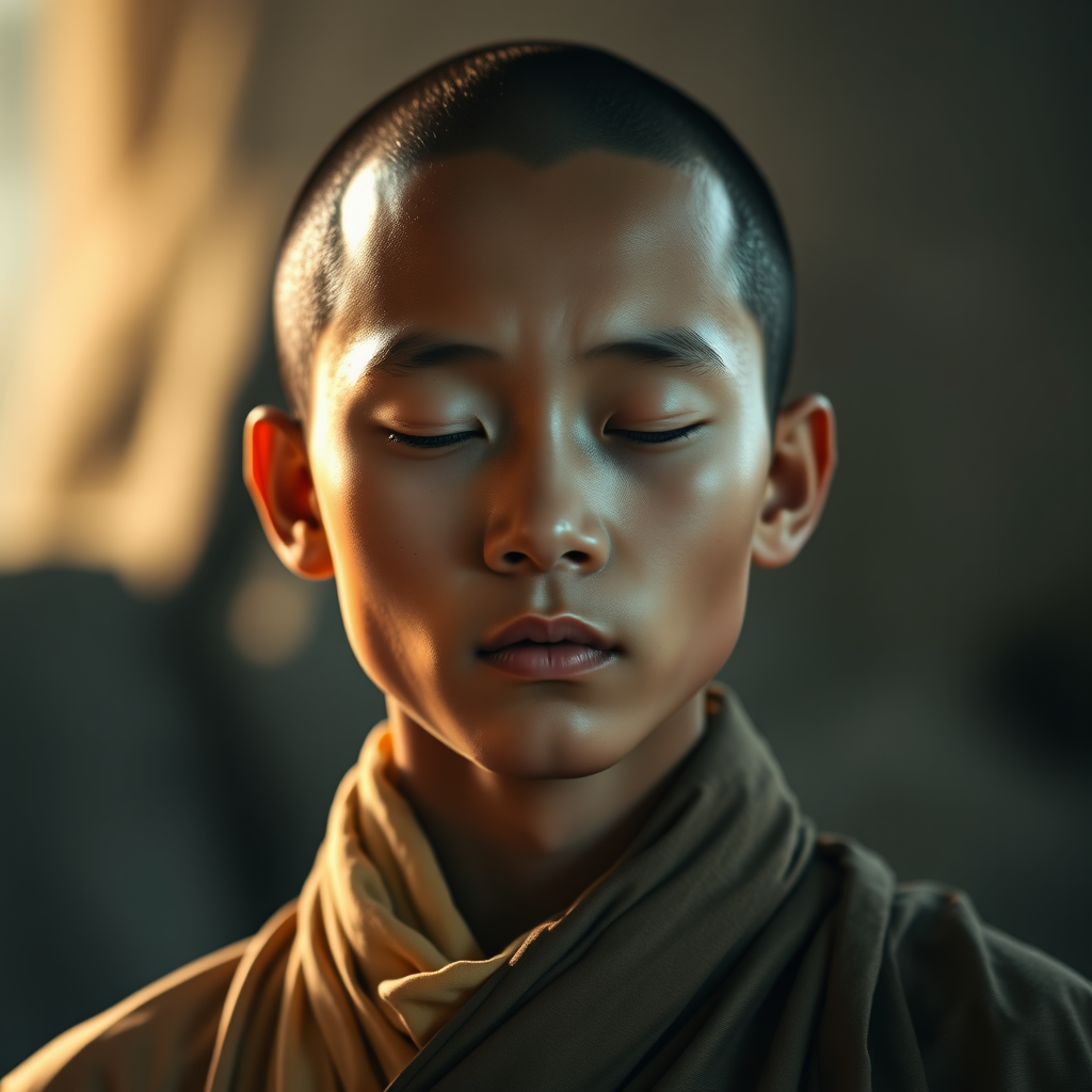 a portrait of a serene and beautiful young monk in a moment of meditation, realistic and radiant, captured with cinematic lighting in 8k resolution, utilizing a 35mm f1.4 lens, reminiscent of fuji color film, enhanced with a soft, calming color palette and gentle shadows to emphasize tranquility, subtle creative adjustments bringing warmth and depth to the expression