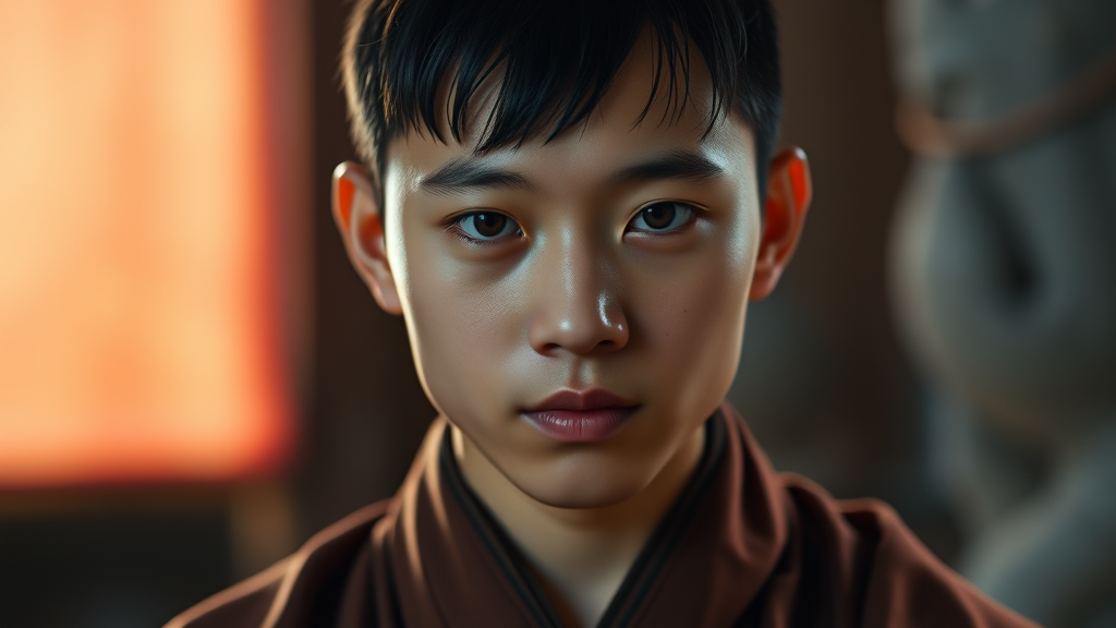 A portrait of a serene and beautiful young zen monk, depicted realistically with radiant features, captured in 8k cinematic lighting. The image utilizes a 35mm f1.4 lens simulating Fuji color film, with a subtle touch of soft lighting to enhance the peaceful aura of the monk. The setting is calm and introspective, inviting a sense of tranquility and presence, all while maintaining a harmonious color palette that complements the monk's tranquil expression.