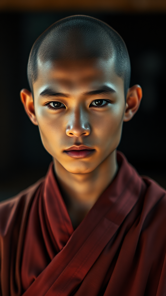 A portrait of a serene young zen monk, strikingly beautiful with a tranquil aura, lifelike and radiant, captured in ultra-high-resolution 8k, featuring cinematic lighting that highlights their peaceful expression. Photographed using a 35mm f1.4 lens on Fuji color film, the image showcases a balanced blend of easy flowing composition with deep contrasting hues, creating a soothing and introspective atmosphere.