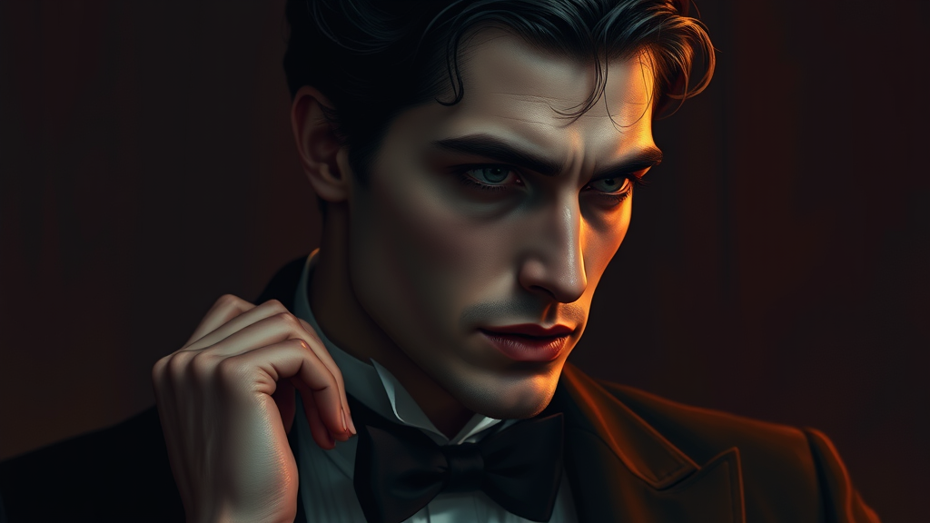 A portrait of a sophisticated, enigmatic dark bohemian vampire, a male figure exuding elegance, with an air of ennui. The illustration features dramatic lighting and gentle detailing, evoking the texture of oil painting on canvas in an art nouveau style. Captured through high-definition, 8k resolution imagery akin to octane render, the artwork draws inspiration from the rich, luminous aesthetics of Edmund Blair Leighton and the otherworldly allure of Brom. There's a softness and grace reminiscent of Charlie Bowater's compositions, trending prominently on art platforms like ArtStation, with facial features crafted in the intricate style of Tom Bagshaw and echoes of John Singer Sargent's portraiture expertise.