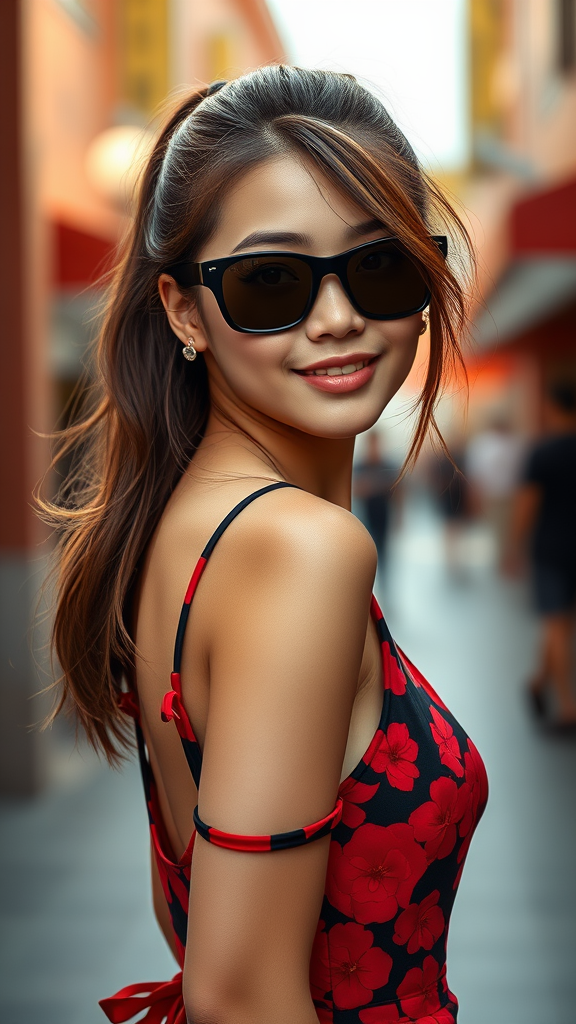 A portrait of a Southeast Asian girl with medium-length brown hair in a ponytail, posing gracefully in a full-length frame. Her face is turned towards the viewer with a friendly expression, showcasing beautifully detailed features reminiscent of the style of Greg Rutkowski and Magali Villanueve. She wears stylish black sunglasses, highlighting her captivating eyes. Her well-proportioned, toned body is adorned with a vibrant red and black flowery mini dress. The scene captures a sense of hyperrealism with intricate details, using sharp focus and cinematic lighting to create an epic movie poster effect. The artwork bursts with colorful, high detail RAW color art, presenting a masterpiece of photography in the realm of hyperrealism.