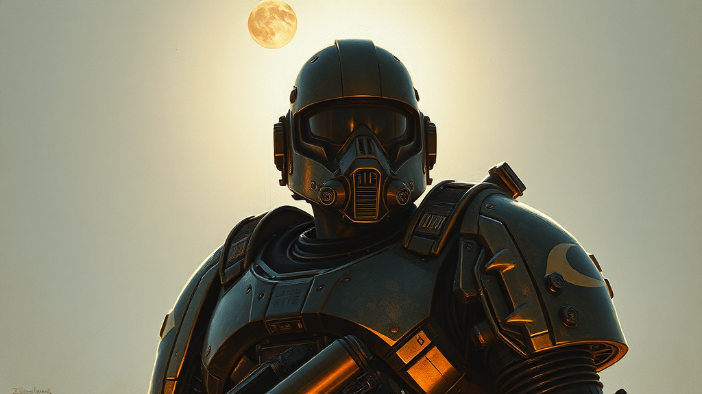 A portrait of a space marine standing under the bright midday sun, intricately detailed with biomechanical elements inspired by H. R. Giger, painted in the rich, textured oil style of Rembrandt. The marine's armor reflects stark contrasts of light and shadow, with subtle golden hues and dark, mysterious undertones, capturing a fusion of futuristic and classical artistry.