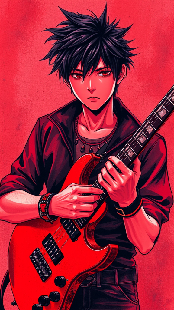A portrait of a stoic, anime-inspired drypoint boy holding a sleek, electric guitar. His dark black hair is styled with edgy spikes, and he wears a punk-inspired wristband that adds to his cool and rebellious demeanor. The scene is infused with rock music energy, capturing his enigmatic and captivating presence. Neon red and hot black hues emphasize his mysterious aura, while the composition reflects the intricate style of a Da Vinci drawing. His intense expression and the vibrant colors create a striking contrast, making the portrait both alluring and dynamic.