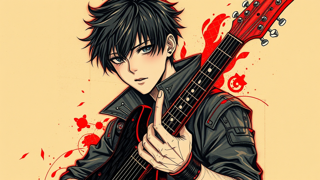A portrait of a stoic Drypoint anime boy clutching a modern, streamlined guitar, infused with rock music essence. His attire features edgy spikes and a punk-inspired wristband. He has dark black hair that complements his cool demeanor. The style is reminiscent of a Davinci sketch, emphasizing a mysterious and captivating focus. The color palette is dominated by striking neon red and deep black, adding to the enigmatic allure of the character. The portrait captures a blend of classic artistry with contemporary, edgy flair.